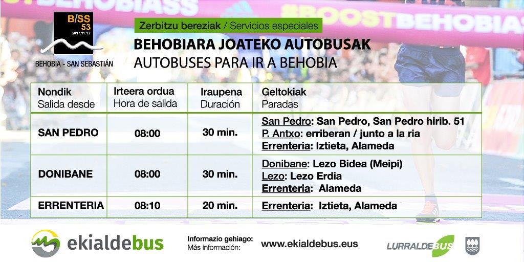 Con motivo de la celebración de la carrera Behobia- San Sebastian que se celebrará el próximo domingo 12 de noviembre, informamos de los horarios de los diferentes medios de transporte públicos, así como los cambios de paradas y líneas y cortes de carreteras previstos.